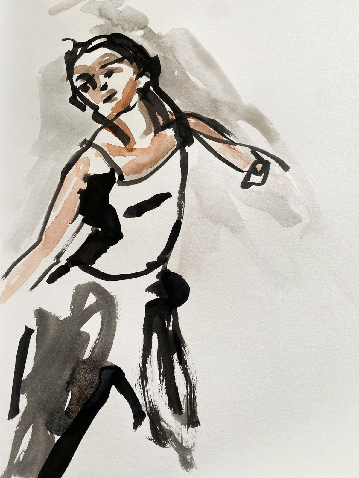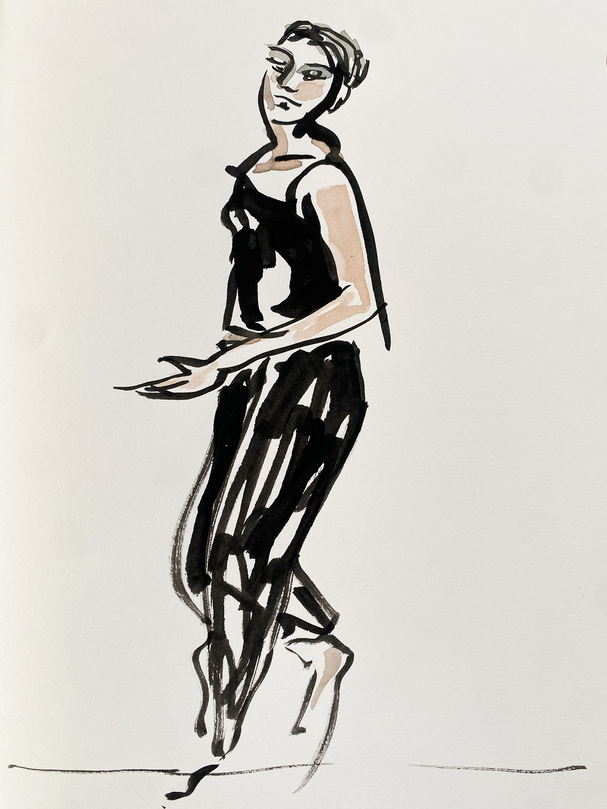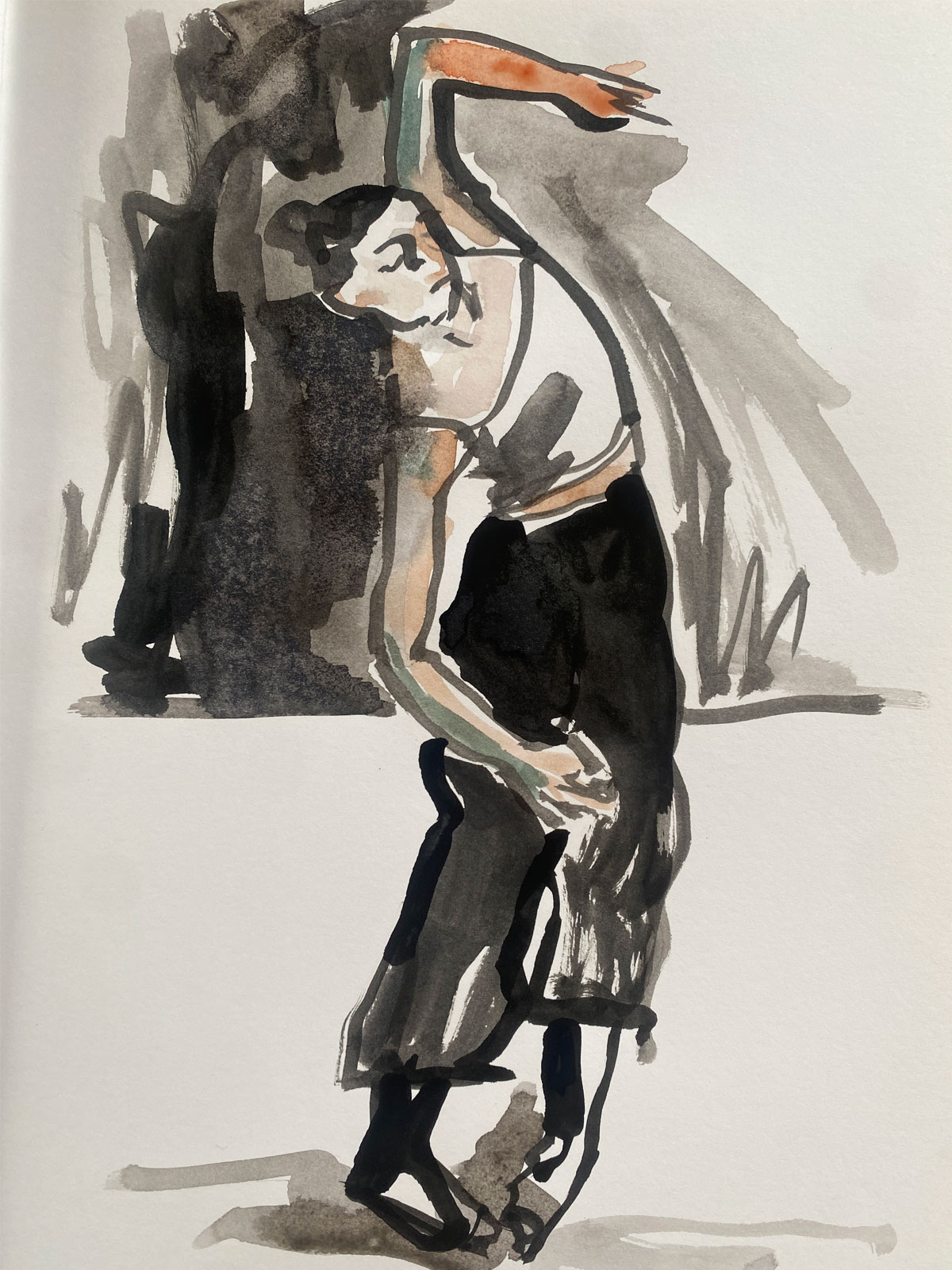 These are a recent addition to my work. Using the velvety feel of Indian ink and subtle water colour seems to capture the fleeting movement of the dancer and the simplicity and beauty of her poses.